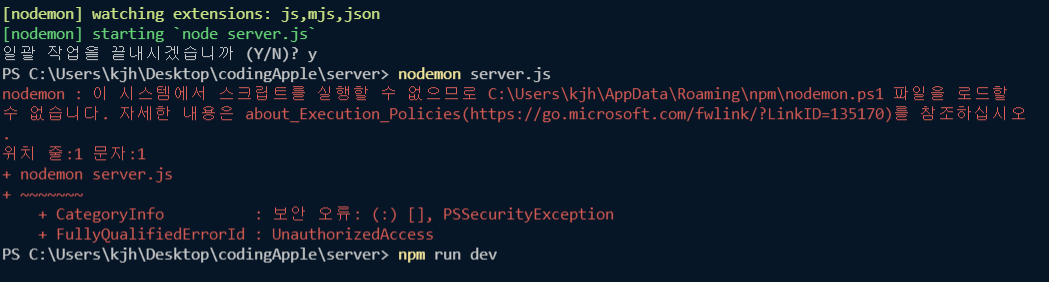 nodemon을 실행하려고 하는데 아래와 같이 error 그래서 여기 velog를 참고하였다. 먼저 아래와 같이 명령어 입력 (-dev를 붙이면, development mode이고 local에서만 사용하겠다는 의미) npm install nodemon --save-dev 그리고 package.json부분에 dev를 추가해준다. 작업하고 있는 파일이 server.js이니까 server.js를 추가해준다. "dev" : "nodemon server.js", npm run dev 명령어로 서버를 실행 하지만 localhost:8080 들어가보니 에러가 뜬다. 머가 문제인지 모르겠다. 해결해야 하는데 30분째 에러찾는중.. https://codingapple.com/course/react-basic/ React..