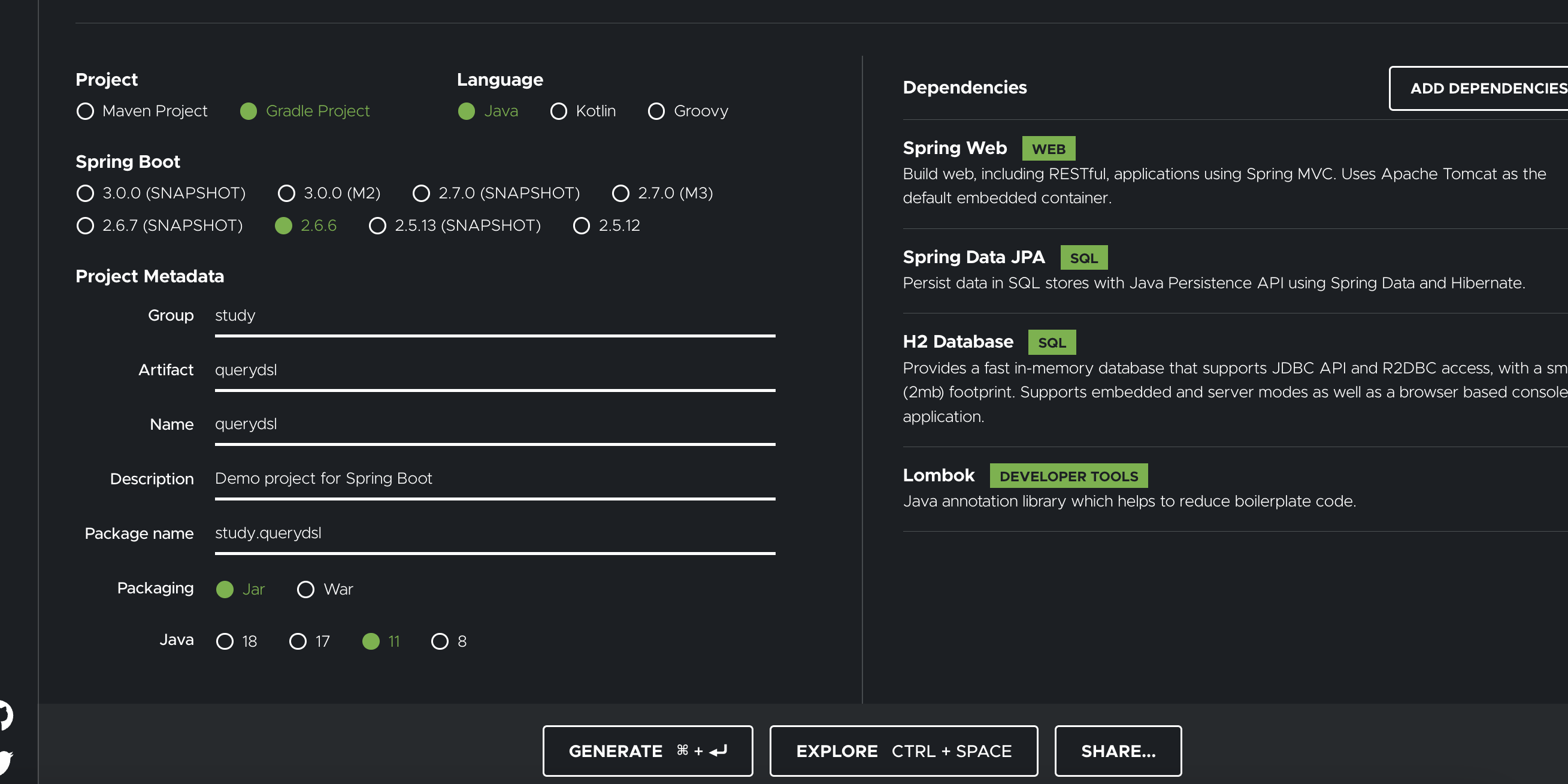 일단 간단하게 프로젝트 세팅을 마치고 QueryDSL 설정과 검증 처음 시도하는 거지만 차근차근 해보자. build.gradle 아래처럼 세팅 // build.gradle plugins { id 'org.springframework.boot' version '2.6.6' id 'io.spring.dependency-management' version '1.0.11.RELEASE' //querydsl 추가 id "com.ewerk.gradle.plugins.querydsl" version "1.0.10" id 'java' } group = 'study' version = '0.0.1-SNAPSHOT' sourceCompatibility = '11' configurations { compileOnly { ..