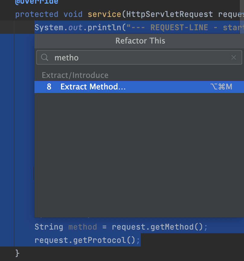 HttpServletRequest를 사용하는 방법에 대해서 알아보자. 아래코드를 Extract Method로 해서 extracting을 해주고 package hello.setvlet.basic.request; import javax.servlet.ServletException; import javax.servlet.annotation.WebServlet; import javax.servlet.http.HttpServlet; import javax.servlet.http.HttpServletRequest; import javax.servlet.http.HttpServletResponse; import java.io.IOException; @WebServlet(name = "requestHeaderServl..