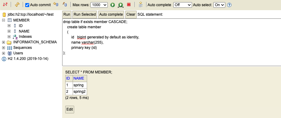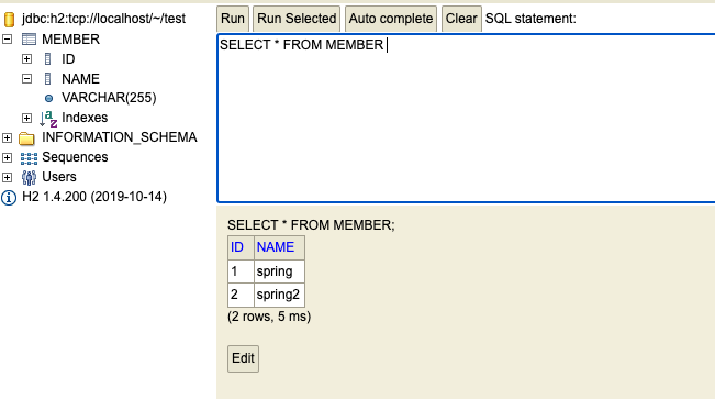 insert into member(name) values("spring2")
