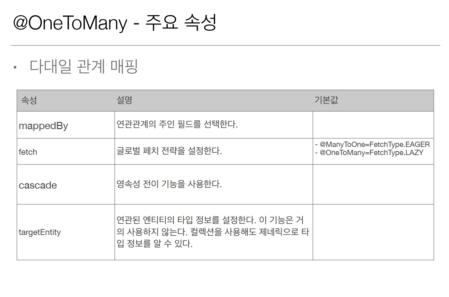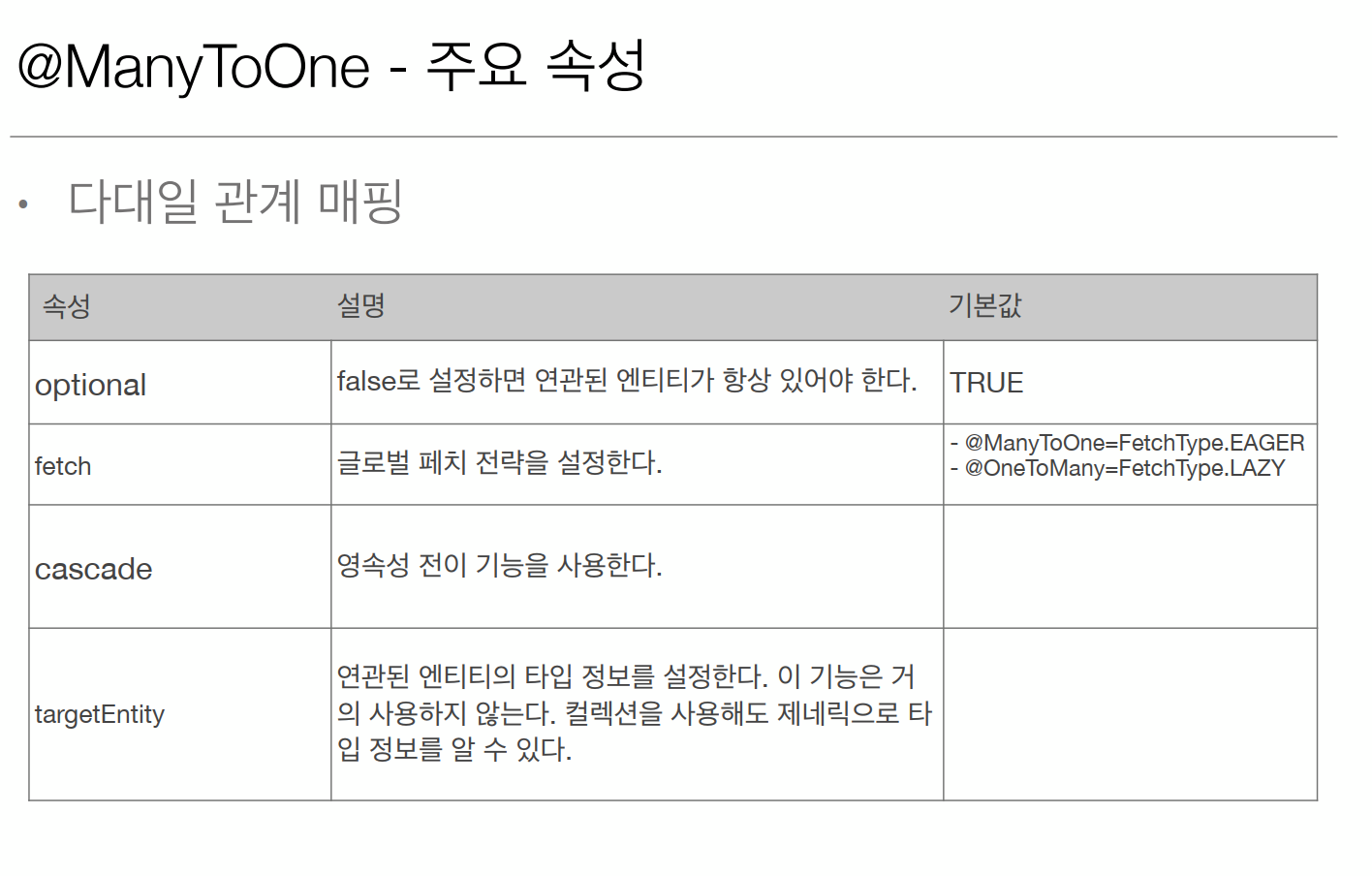 아래 속성에서 Many to one은 연관관계의 주인이 되어야 한다.