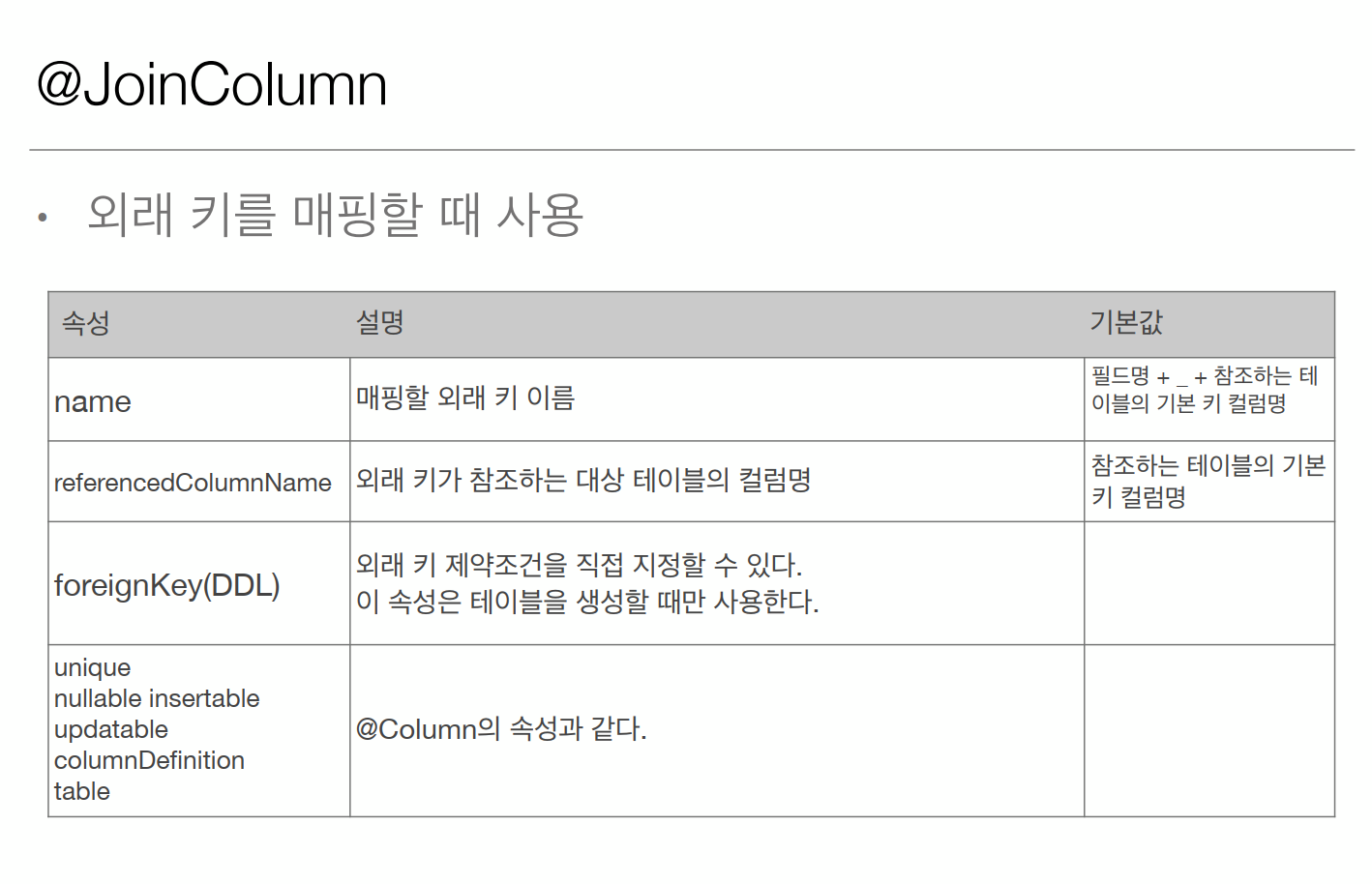 @joincolumn에서 매핑할 외래 키 이름 name과 referencedColumnName 외래 키가 참조하는 대상 테이블의 컬럼명을 참조해주자.