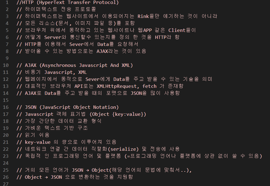 Hypertext(문서나, 이미지파일들, 웹사이트에서 이용되어지고 있는 hyperlinks) Transfer Protocal로써 어떻게 hypertext를 서로 주고 받을 수 있는지를 규약한 protocol의 일종이다. client는 server에게 data를 request해주고 server는 client에게 그에 맞는 응답을 response해준다. http를 이용해서 server에게 데이터를 요청해서 받아올 수 있는 방법으로는 AJAX를 썼다. (Asynchronous JavaScript And XML)=> 웹페이지에서 동적으로 서버에게 데이터를 주고 받을 수 있는 기술을 의미 (대표적인 예로는 XHR, XMLHttpRequest라는 object)가 있다.) 브라우저 API에서 제공하는 object중 ..