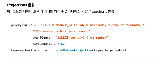JPA가 SQL query를 그대로 사용하는 네이티브 쿼리를 지원한다. 하지만 가급적 네이티브 쿼리는 사용하지 않는게 좋다. 최근에 나온 final 방법 => 스프링 데이터 Projections 활용 스프링 데이터 JPA 기반 네이티브 쿼리 페이징 지원 반환 타입 Object[] Tuple DTO(스프링 데이터 인터페이스 Projections 지원) 제약이 있는데 Sort 파라미터를 통한 정렬이 정상 동작하지 않을 수 있고 JPQL처럼 Application loading 시점에 문법 확인이 불가하고 동적 쿼리가 불가능하다. // MemberRepository Interface @Query(value = "select * from member where username = ?", nativeQuery = ..
