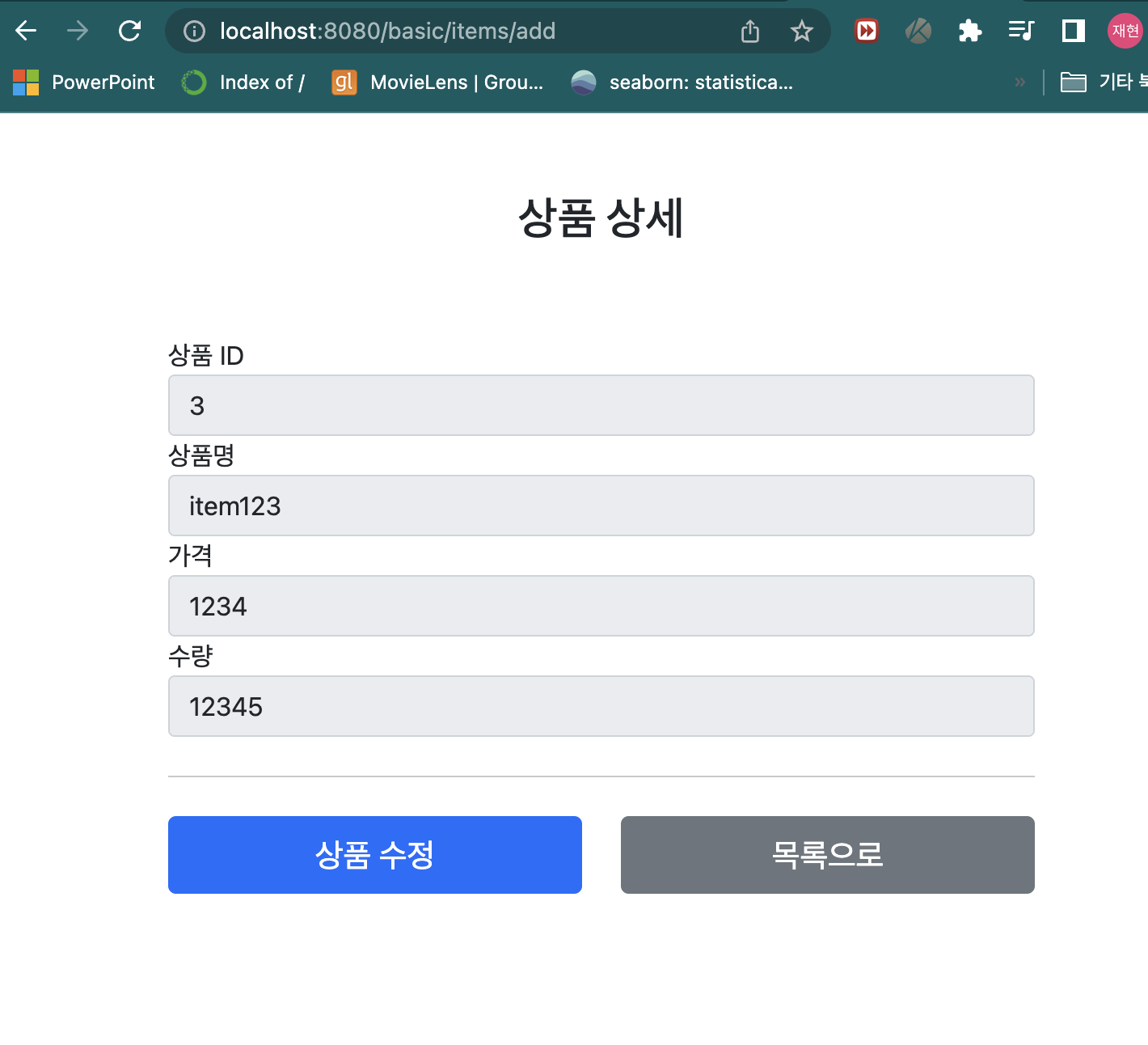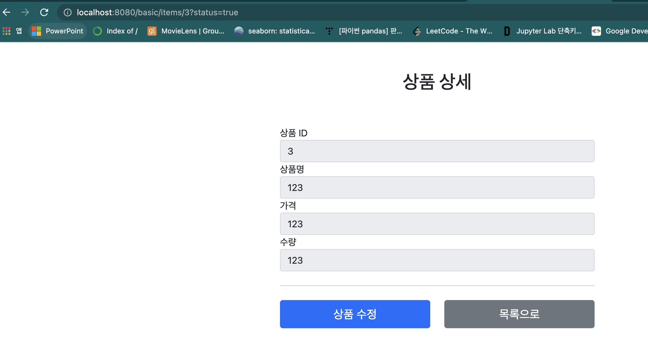이제 저장이 잘 되었으면 상품 상세 화면에 "저장되었습니다."라는 메시지를 보여주게 해보자. addItemV5에 있던 PostMapping는 주석처리 해주고 V6를 만들어 주자. // @PostMapping("/add") public String addItemV5(Item item) { itemRepository.save(item); return "redirect:/basic/items/" + item.getId(); } @PostMapping("/add") public String addItemV6(Item item, RedirectAttributes redirectAttributes) { Item savedItem = itemRepository.save(item); redirectAttributes...